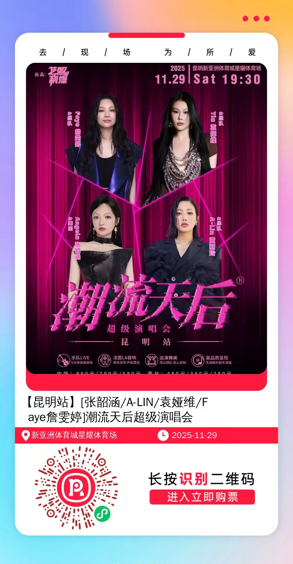 购票提醒:直接打开左侧海报(鼠标移动到海报上,右键选择“在新标签页打开图片”),用手机打开微信扫描海报中的二维码,扫描之后手机登录即可购票。如有疑问,可加微信cary7790咨询,下单后全程跟单,跟进一切关于门票的问题。