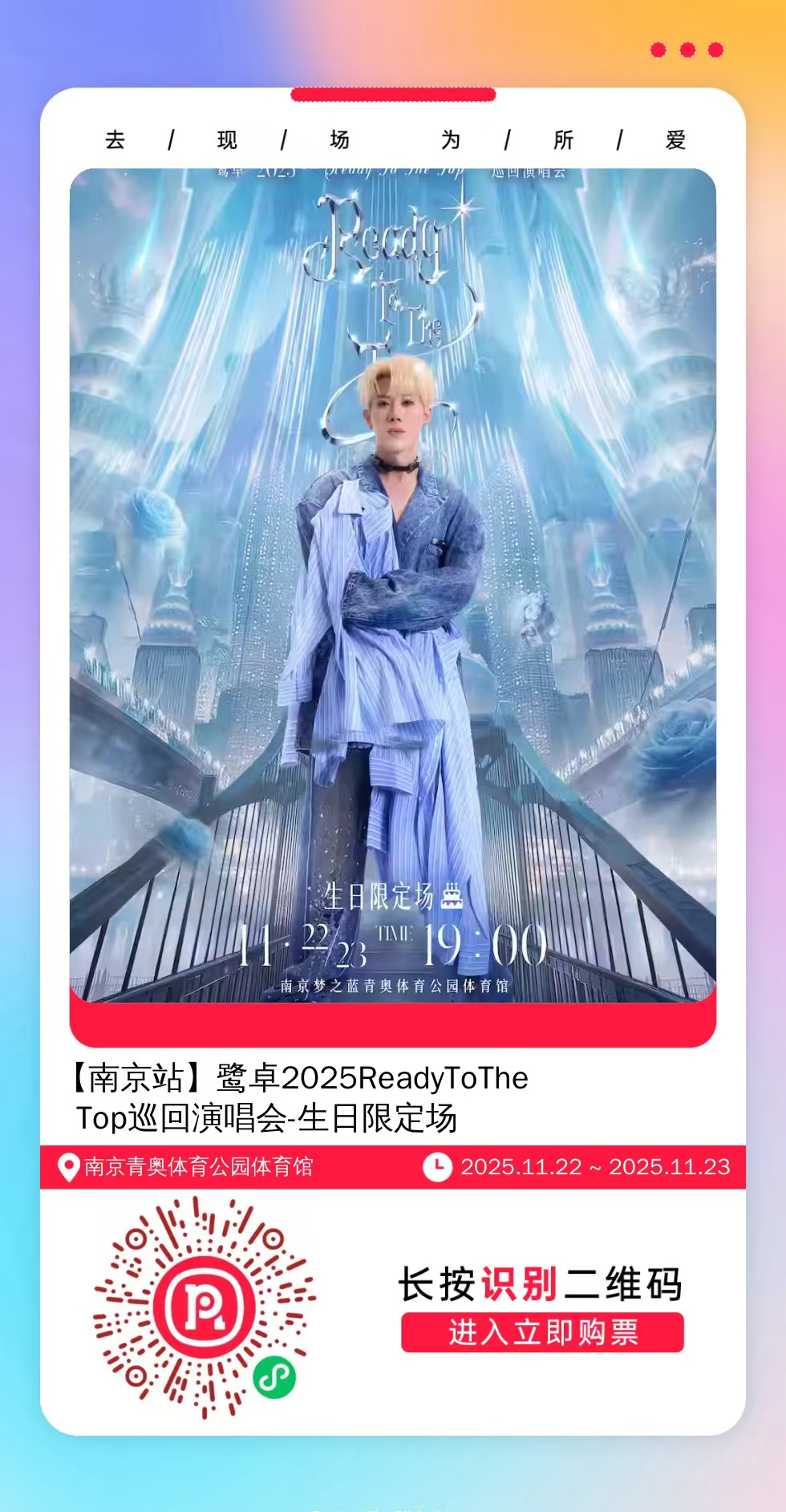 购票提醒:直接打开左侧海报(鼠标移动到海报上,右键选择“在新标签页打开图片”),用手机打开微信扫描海报中的二维码,扫描之后手机登录即可购票。如有疑问,可加微信cary7790咨询,下单后全程跟单,跟进一切关于门票的问题。