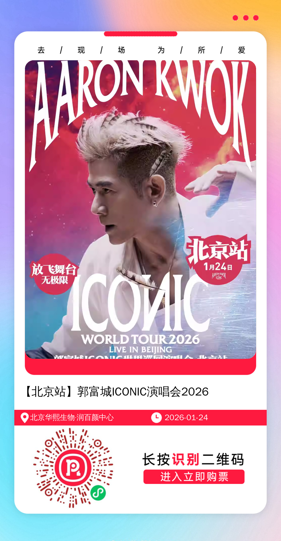 购票提醒:将左侧海报保存至手机,打开微信扫一扫,选择手机相册中保存的海报,扫描之后手机登录即可购票。如有疑问,可加微信cary7790咨询,下单后全程跟单,跟进一切关于门票的问题。