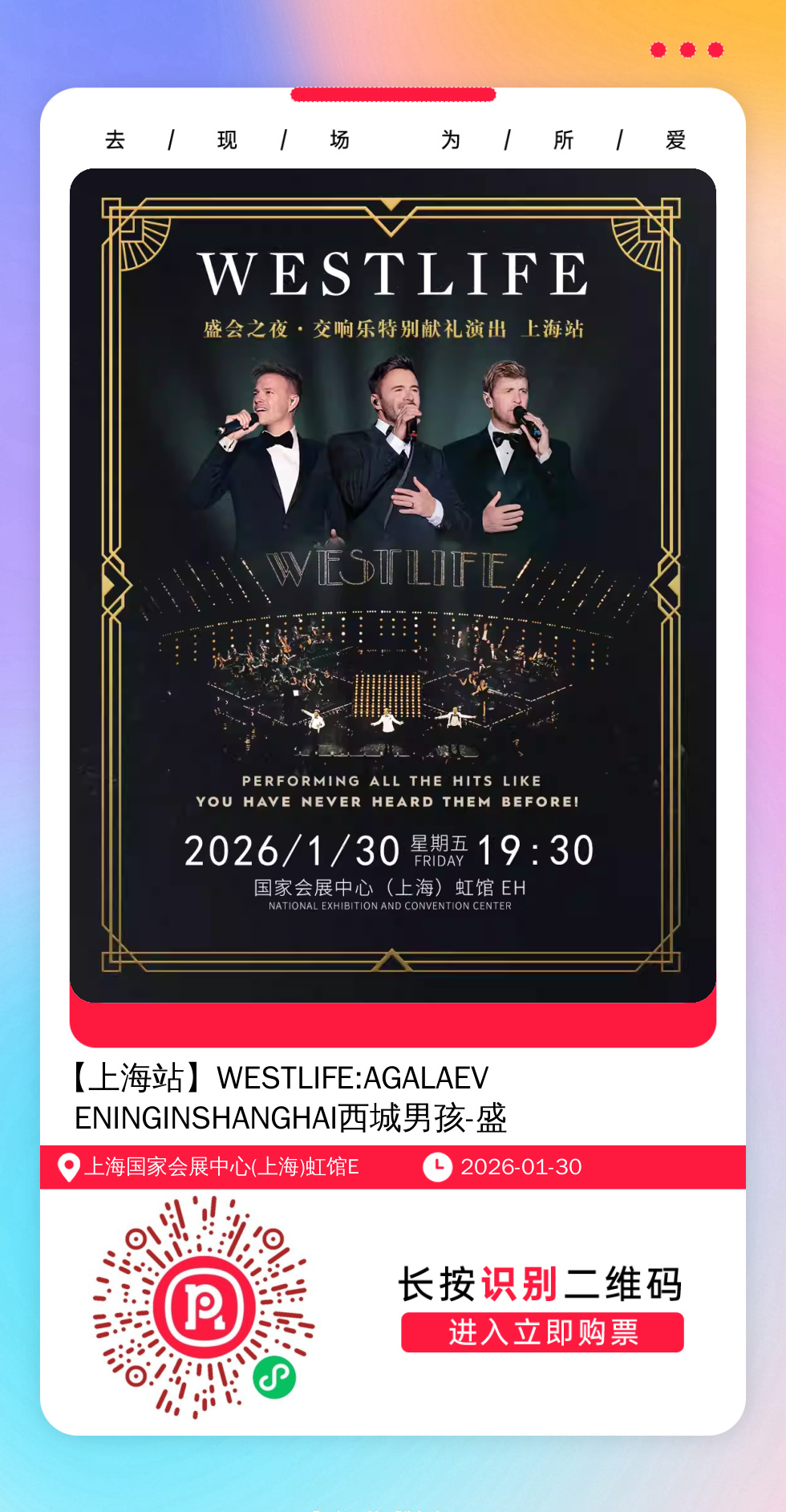 购票提醒:直接打开左侧海报(鼠标移动到海报上,右键选择“在新标签页打开图片”),用手机打开微信扫描海报中的二维码,扫描之后手机登录即可购票。如有疑问,可加微信cary7790咨询,下单后全程跟单,跟进一切关于门票的问题。